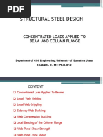 Web crippling Compression buckling of the web Panel zone web shear The size of stiffener required depends on which limit state is exceeded. Local flange bending can occur when concentrated tensile forces are applied to the column. The design strength of the flange from Section K1.2 of the Specifications is Rn, where: = 0.90 Rn = 6.25tf2Fyf and tf = flange thickness, Fyf = yield stress of the flange material. Stiffeners that extend to at least half the depth of the column web are required when this limit state is exceeded and should be located at the application of the tensile force, Figure 1.3. These stiffeners must be welded to the loaded flange and the weld between the stiffener(s) and the web must be large enough to allow the unbalanced force in the stiffener to be transmitted to the web (Specifications 1993). When a force is being transmitted through the web, local web yielding may occur. The strength of the member depends upon the location of the concentrated force(s) relative to the top of the column when considering this limit state, Figure 1.4. The design strength of the web from Section K1.3 of the Specifications is as follows: When the concentrated force is located at a distance greater than the depth of the member away from the member end, = 1.0 Rn = (5k + N) Fyw tw where k = distance from outer face of flange to web toe of fillet, N = length of bearing, Fyw = yield stress of web material, tw = web thickness. When the concentrated force is acting at a distance less than or equal to the depth of the member d from the member end,