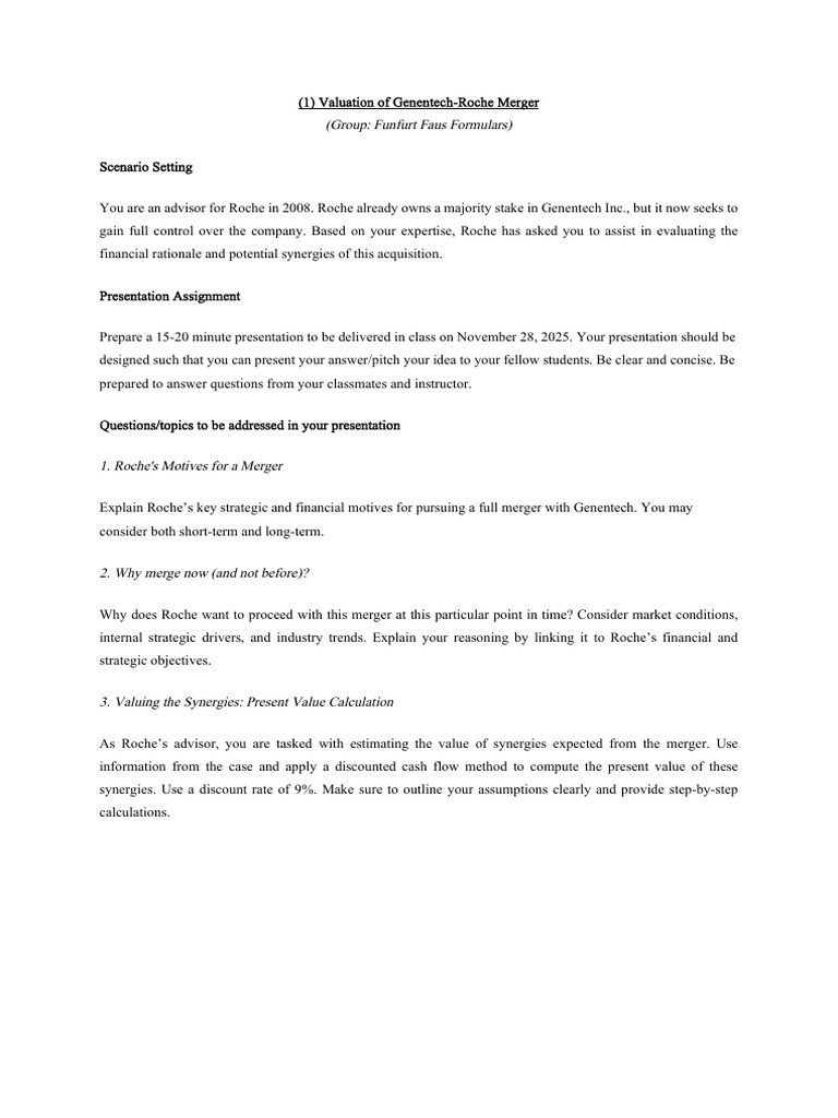 gain full control over the company. Based on your expertise, Roche has asked you to assist in evaluating the