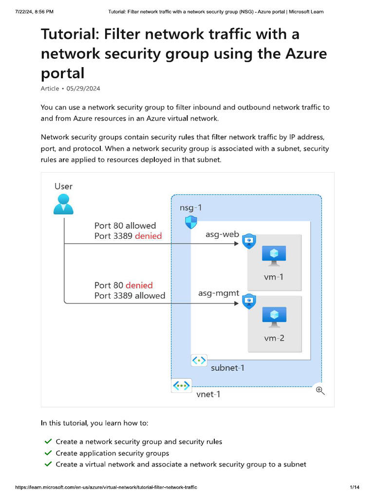 hitps:leam microsoft.comlen-usiazurelvitual-networktutoriafiter-network-trafic ana‘722124, 856 PM Tutorial: Fitor network vale with a network securty group (NSG) -Azure portal | Mlrosoft Loam