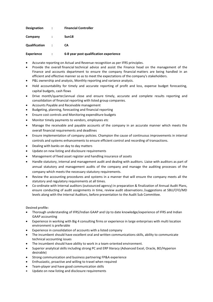 Desired profile: Thorough understanding of IFRS/Indian GAAP and Up to date knowledge/experience of IFRS and Indian GAAP accounting Experience in working with Big 4 consulting firms or experience in large enterprises with multi location environment is preferable Experience in consolidation of accounts with a listed company The incumbent should have excellent oral and written communications skills, ability to communicate technical accounting issues The incumbent should have ability to work in a team-oriented environment. Superior analytical skills including strong PC and ERP literacy (Advanced Excel, Oracle, BO/Hyperion desirable) Strong communication and business partnering FP&A experience Enthusiastic, proactive and willing to travel when required Team-player and have good communication skills Update on new listing and disclosure requirements