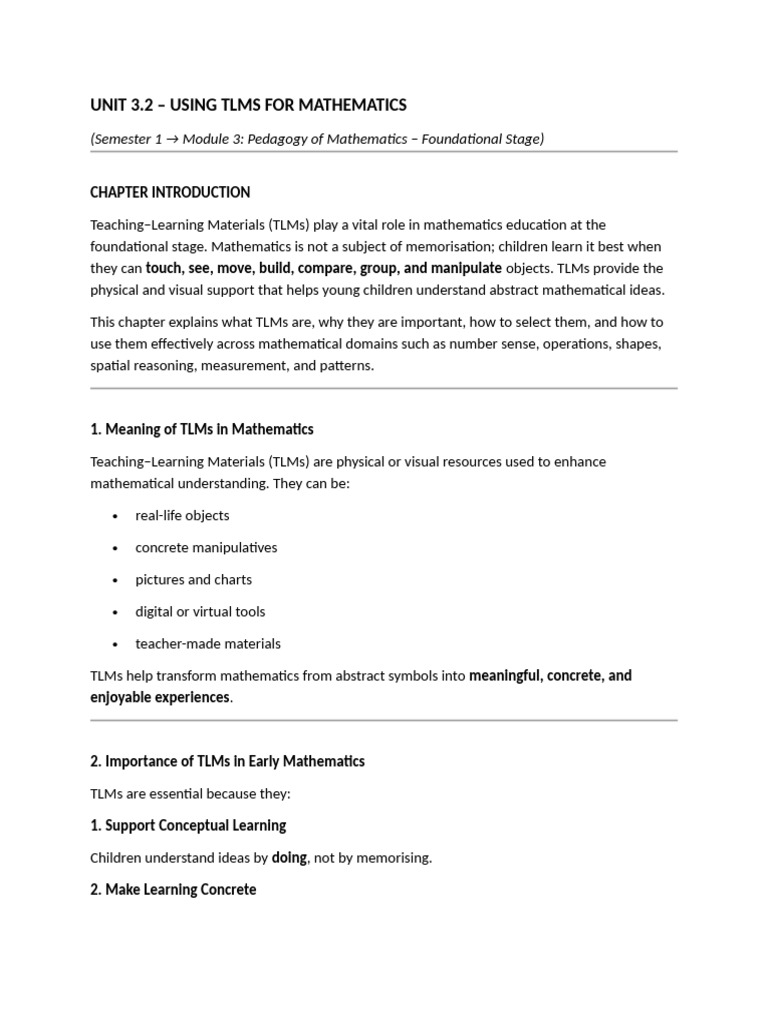 TLMs are central to mathematics teaching at the foundational stage. They support conceptual