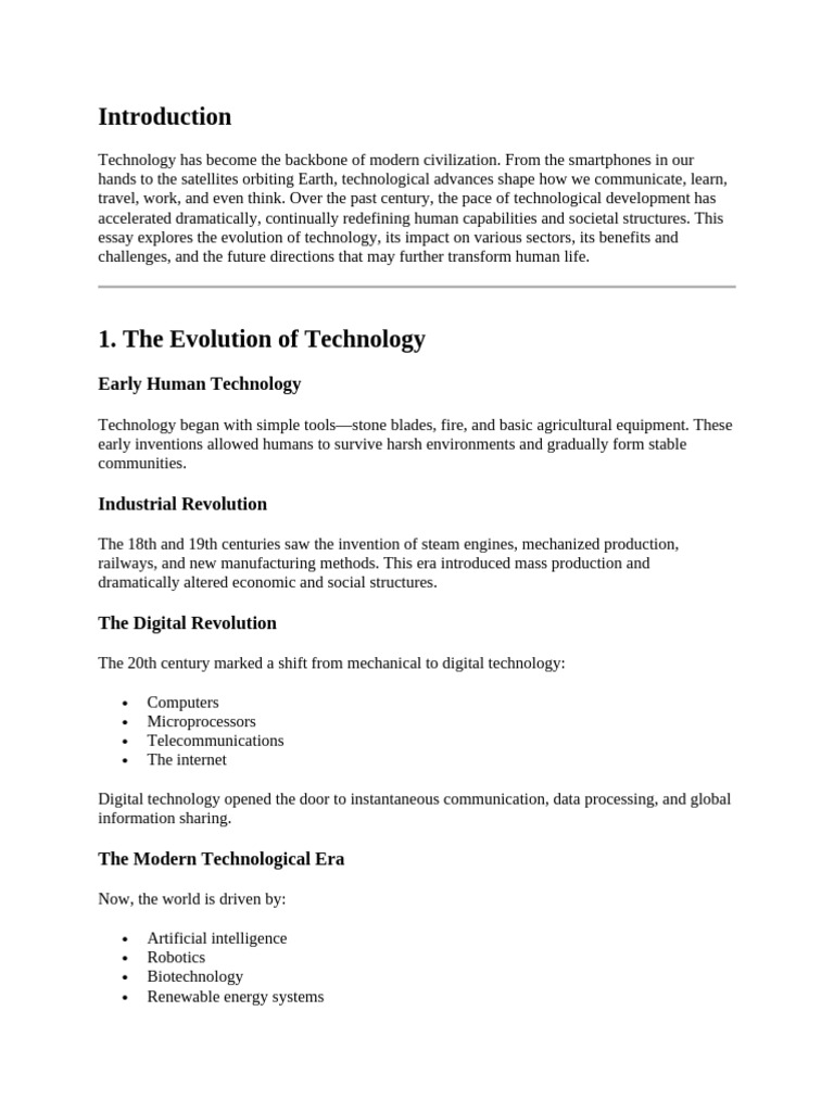 essay explores the evolution of technology, its impact on various sectors, its benefits and