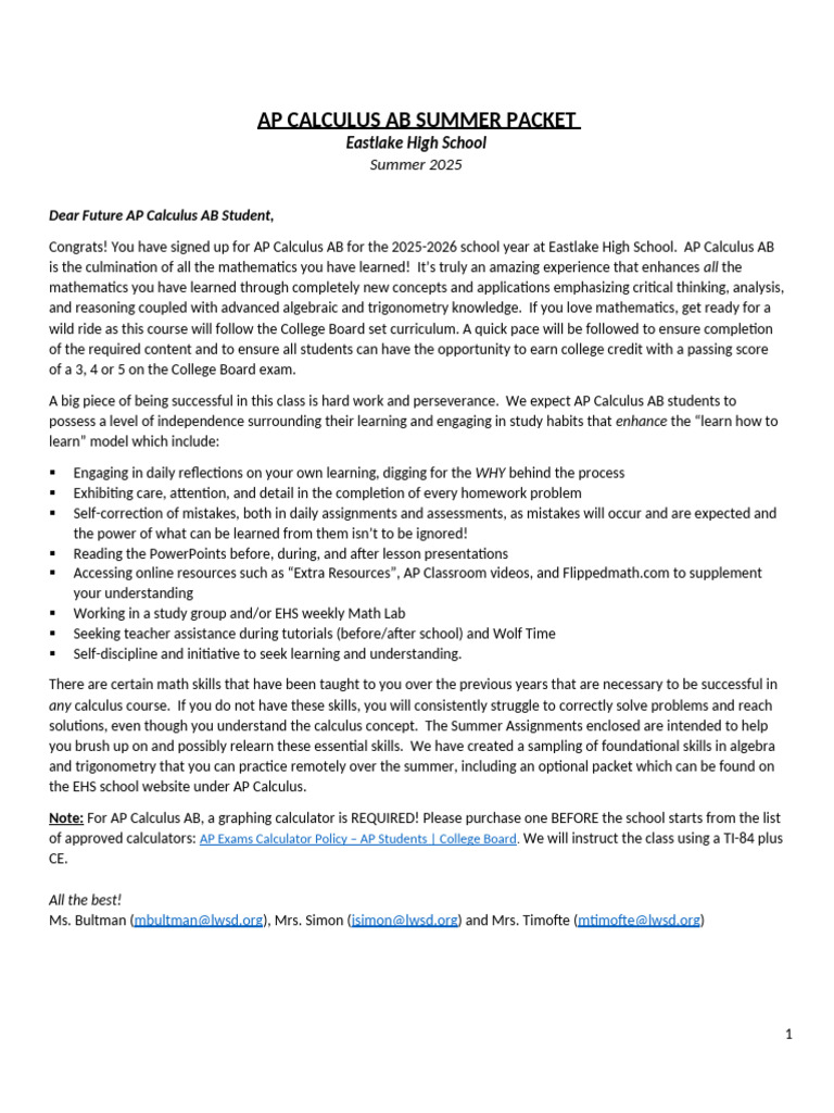 Congrats! You have signed up for AP Calculus AB for the 2025-2026 school year at Eastlake High School. AP Calculus AB