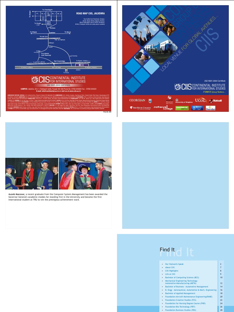 challenging. CIIS give a unique option to students by offering the exact same North American education right here in India at a fraction of the cost. CIIS, in India, is an extension campus of Georgian College, Thompson Rivers University, Canada, University of Brighton, UK and Waiariki Institute, New Zealand all these Colleges & Universities are funded and managed by respective provincial Governments and are rated among the largest Co-op Institutes within Canada, UK & New Zealand. At CIIS, it is a strong belief that academic and professional exchange as a means for transferring knowledge across borders is critical for preparing a new generation of global citizens. Thus, realizing the need for an institute offering students quality International education, where close attention to each student would inspire and develop their self confidence, the Continental Institute for International Studies brings courses in India to award International College diplomas and International University degrees right here. What is more important is that these diplomas / degrees cost a mere fraction of what a student would spend in the US or Canada and get exactly the same education with the option of completing a part of the program in India and taking transfer to the overseas campus after one or two years of study.