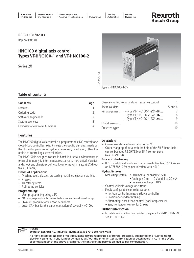 The HNC100 digital axis control is a programmable NC control for a Operation: