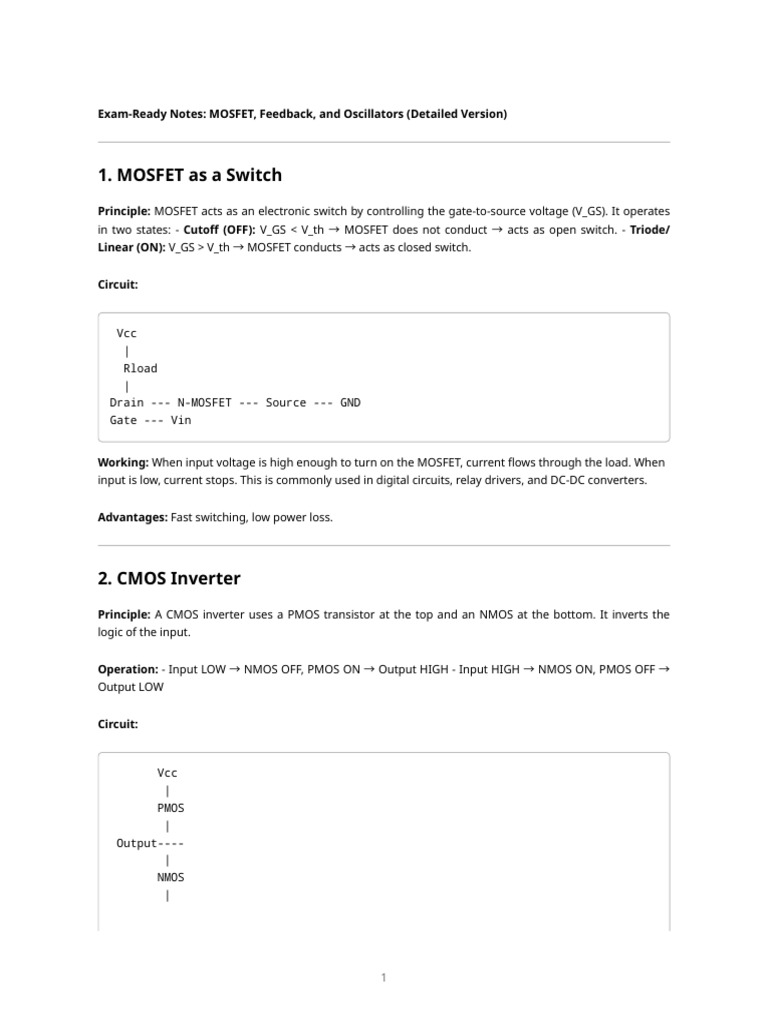 Exam-Ready Notes: MOSFET, Feedback, and Oscillators (Detailed Version)