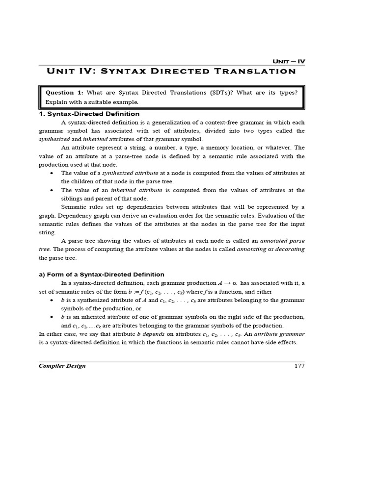 Question 1: What are Syntax Directed Translations (SDTs)? What are its types?