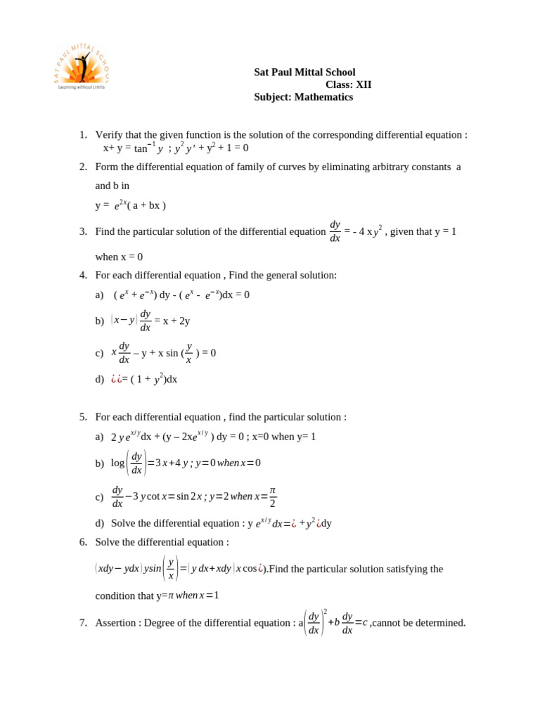 1. Verify that the given function is the solution of the corresponding differential equation :