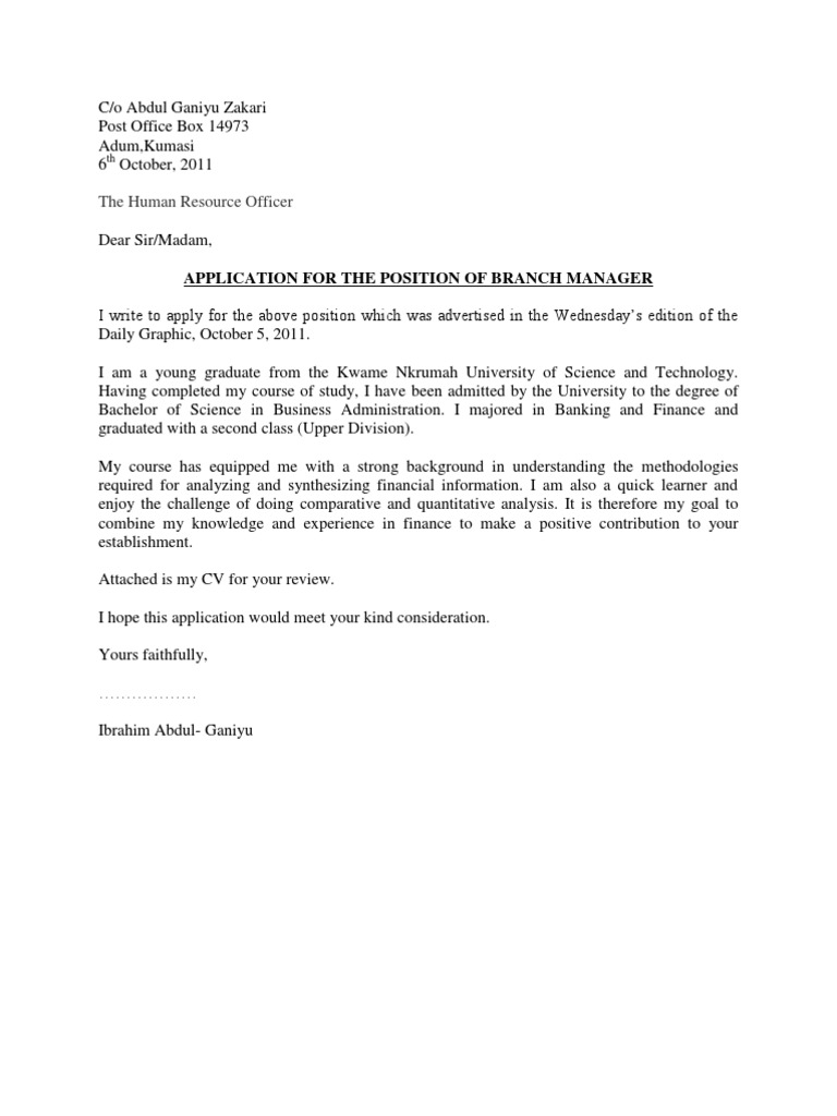 Officer Dear Sir/Madam, APPLICATION FOR THE POSITION OF BRANCH MANAGER I write to apply for the above position which was advertised in the Wednesdays edition of the Daily Graphic, October 5, 2011. I am a young graduate from the Kwame Nkrumah University of Science and Technology. Having completed my course of study, I have been admitted by the University to the degree of Bachelor of Science in Business Administration. I majored in Banking and Finance and graduated with a second class (Upper Division). My course has equipped me with a strong background in understanding the methodologies required for analyzing and synthesizing financial information. I am also a quick learner and enjoy the challenge of doing comparative and quantitative analysis. It is therefore my goal to combine my knowledge and experience in finance to make a positive contribution to your establishment. Attached is my CV for your review. I hope this application would meet your kind consideration. Yours faithfully, Ibrahim Abdul- Ganiyu