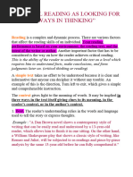Is always making sense of the text as opposed to simply decoding words. Meaningful reading instead of word by word reading. Understands the goal for reading and taps into the prior knowledge needed. Makes connections, predictions and or draws inferences in reading passages. Understands the important information in reading passages. Self corrects, re-reads when necessary to enhance understanding. Stops periodically to ensure understanding or uses some reflective thought. Reads for enjoyment or to discover something. Demonstrates a positive attitude toward reading. A weaker reader isnt persistent and will often require a great deal of prompting.