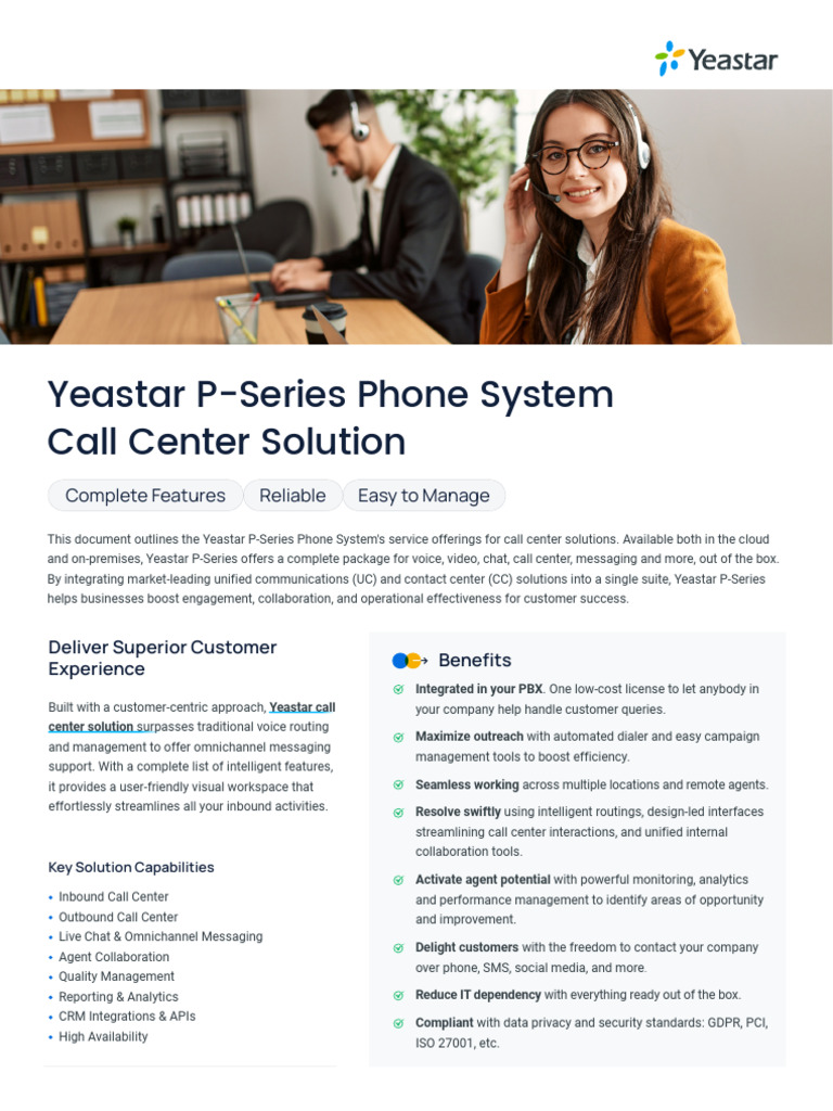This document outlines the Yeastar P-Series Phone System's service offerings for call center solutions. Available both in the cloud