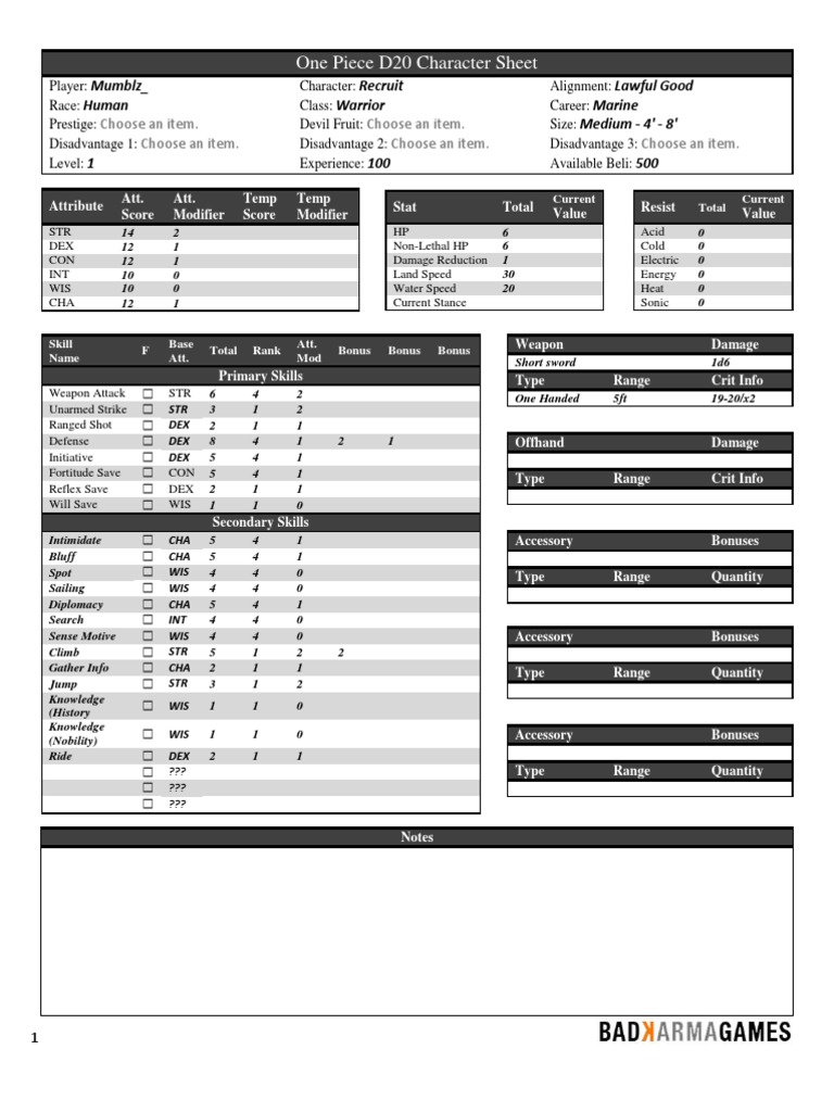 Character: Recruit Class: Warrior Devil Fruit: Choose an item. Disadvantage 2: Choose an item. Experience: 100 Temp Score Temp Modifier Stat
