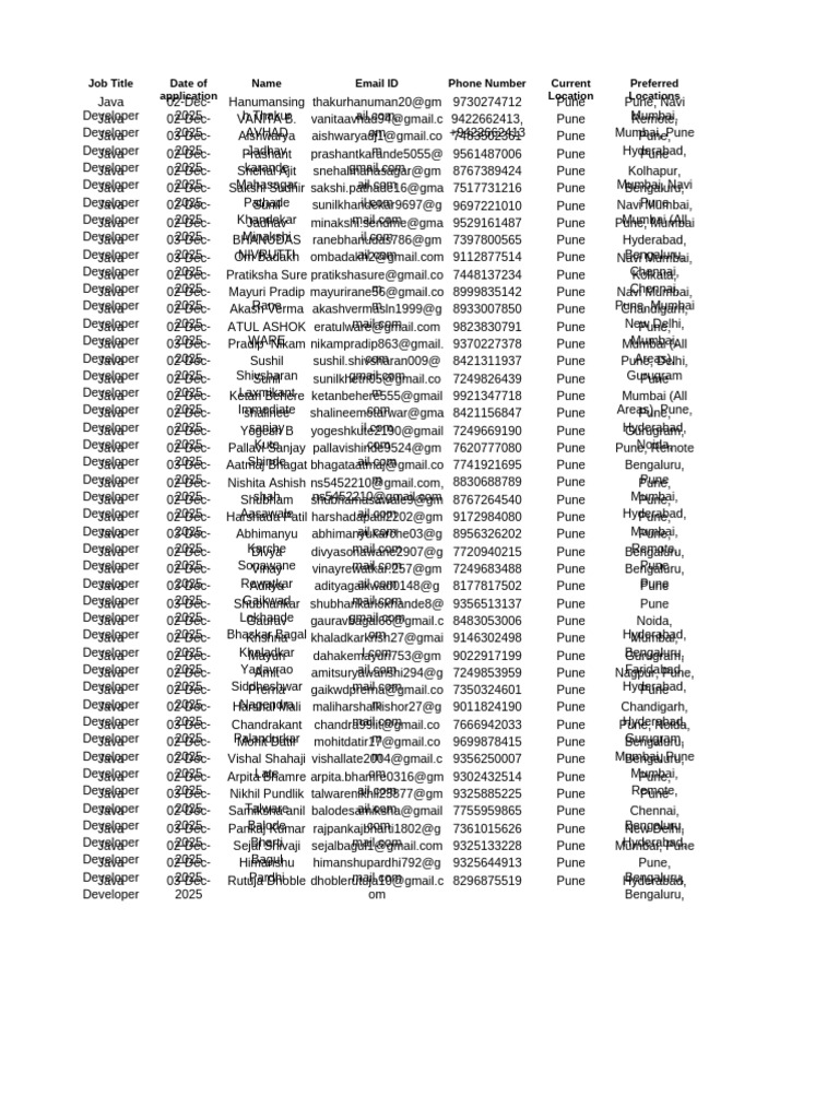 Job Title Date of Name Email ID Phone Number Current Preferred