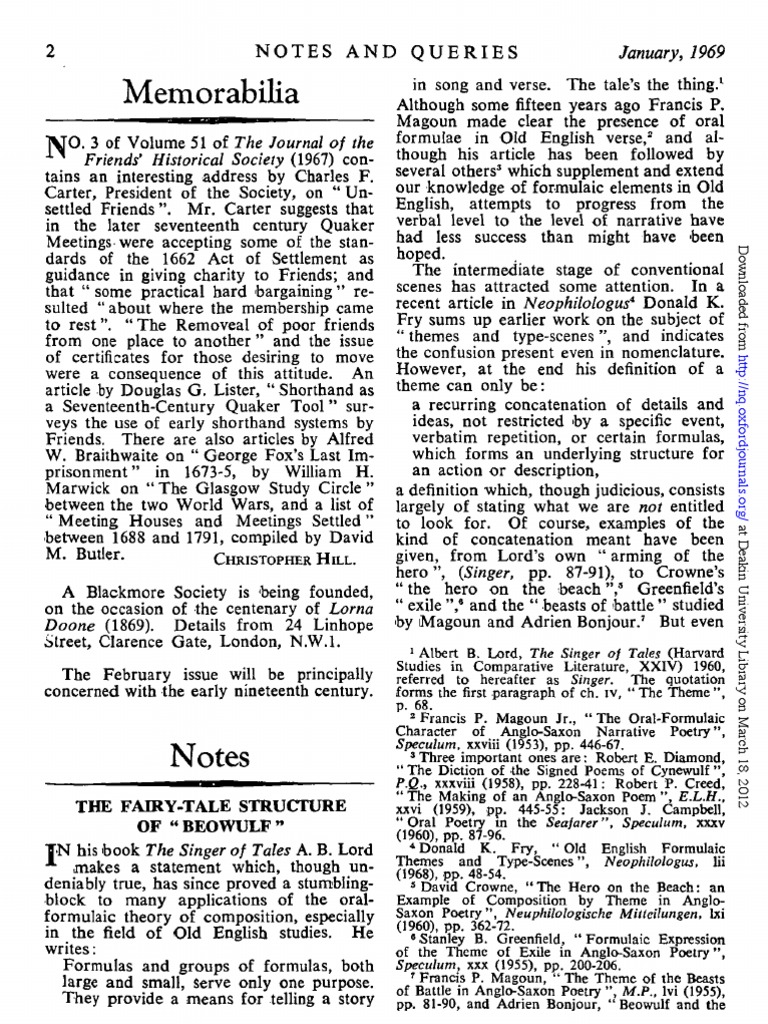 in song and verse. The tale's the thing.1 Although some fifteen years ago Francis P. Magoun made clear the presence of oral 2 in Old alTVO. 3 of Volume 51 of The Journal of the formulaehis article English verse, and by x though has been followed ^ Friends' Historical Society (1967) con- several others3 which supplement and extend tains an interesting address by Charles F. Carter, President of the Society, on " Un- our knowledge of formulaic elements in Old settled Friends". Mr. Carter suggests that English, attempts to progress from the in the later seventeenth century Quaker verbal level to the level of narrative have Meetings were accepting some of the stan- had less success than might have been dards of the 1662 Act of Settlement as hoped. The intermediate stage of conventional guidance in giving charity to Friends; and that " some practical hard 'bargaining " re- scenes has attracted some attention. In a 4 sulted " about where the membership came recent article in Neophilologus Donald K. to rest". " The Removeal of poor friends Fry sums up earlier work on the subject of from one place to another " and the issue " themes and type-scenes ", and indicates of certificates for those desiring to move the confusion present even in nomenclature. were a consequence of this attitude. An However, at the end his definition of a article by Douglas G. Lister, " Shorthand as theme can only be: a Seventeenth-Century Quaker Tool" sura recurring concatenation of details and veys the use of early shorthand systems by ideas, not restricted 'by a specific event, Friends. There are also articles by Alfred verbatim repetition, or certain formulas, W. Braithwaite on " George Fox's Last Imwhich forms an underlying structure for prisonment" in 1673-5, by William H. an action or description, Marwick on " The Glasgow Study Circle " a definition which, though judicious, consists between the two World Wars, and a list of largely of stating what we are not entitled " Meeting Houses and Meetings Settled" to look for. Of course, examples of the between 1688 and 1791, compiled by David kind of concatenation meant have been M. Butler. CHRISTOPHER HILL. given, from Lord's own " arming of the hero", (Singer, pp. 87-91), 3 to Crowne's A Blackmore Society is 'being founded, " the hero on the beach ", Greenfield's 6 on the occasion of the centenary of Lorna " exile ", and the " beasts of battle " studied by Magoun and Adrien Bonjour.7 But even Doone (1869). Details from 24 Linhope Street, Clarence Gate, London, N.W.I. 1