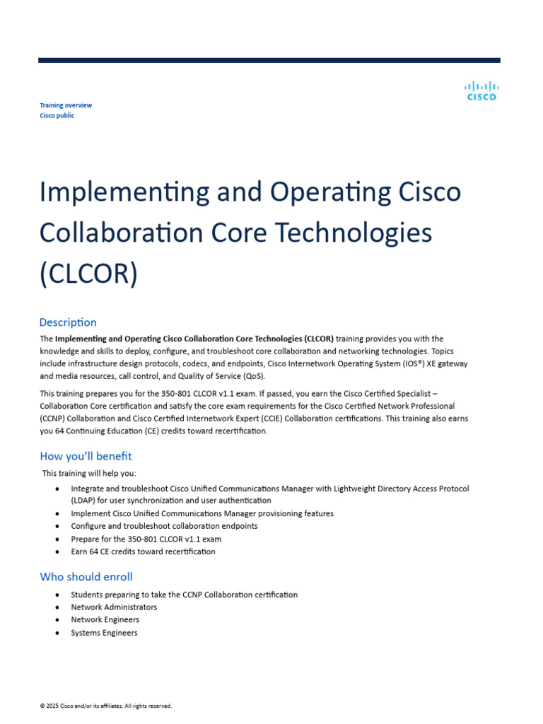 The Implementing and Operating Cisco Collaboration Core Technologies (CLCOR) training provides you with the