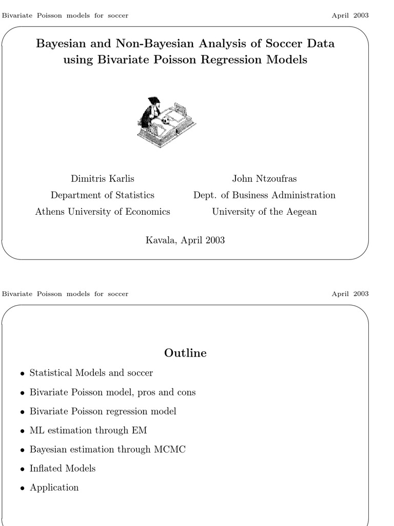 Statistical Models and soccer Bivariate Poisson model, pros and cons Bivariate Poisson regression model ML estimation through EM Bayesian estimation through MCMC Inated Models Application