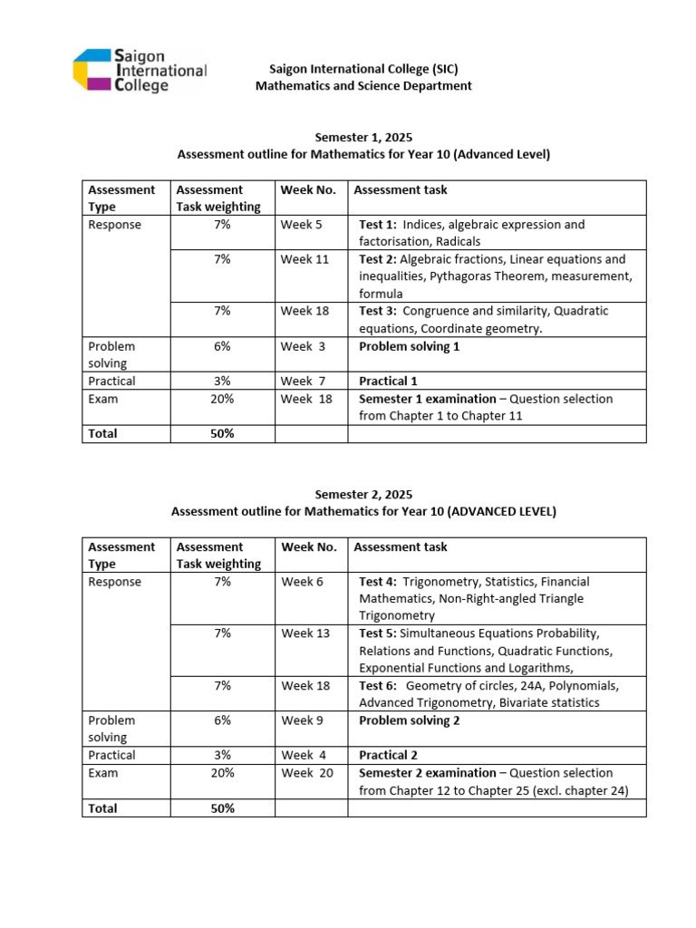 Assessment outline for Mathematics for Year 10 (ADVANCED LEVEL)