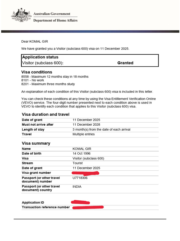 We have granted you a Visitor (subclass 600) visa on 11 December 2025.