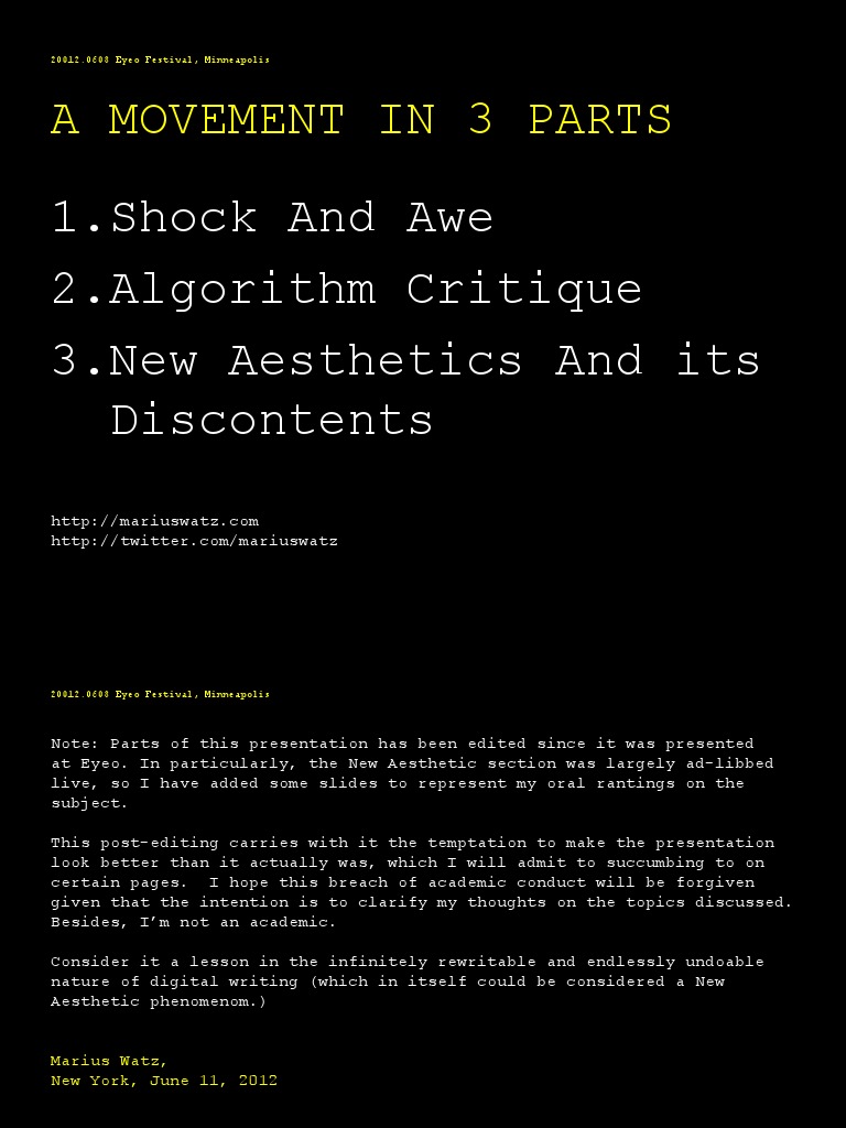 A MOVEMENT IN 3 PARTS1.Shock And Awe2.Algorithm Critique3.New Aesthetics And its Discontents