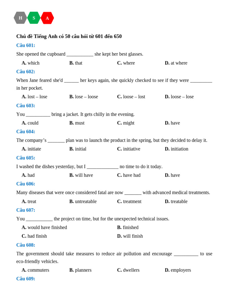 Chủ đề Tiếng Anh có 50 câu hỏi từ 601 đến 650