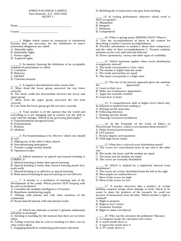 B. It discriminates between the lowest and the highest ______131. You have a pupil who is so talkative, naughty and