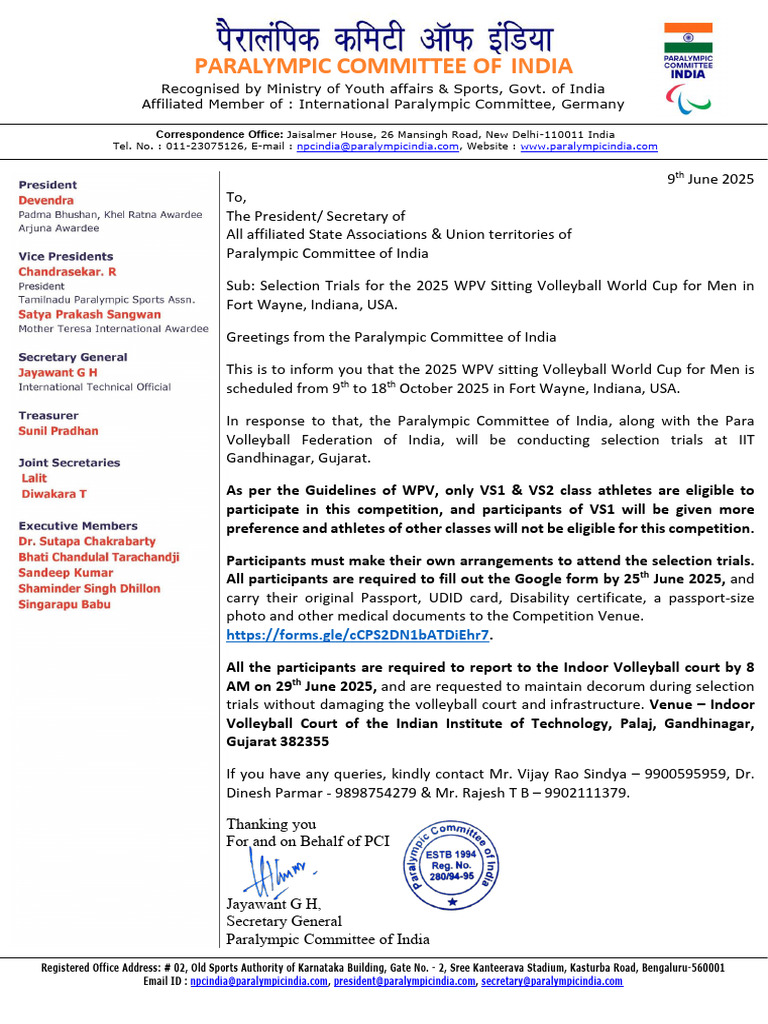 Email ID : npcindia@paralympicindia.com, president@paralympicindia.com, secretary@paralympicindia.com