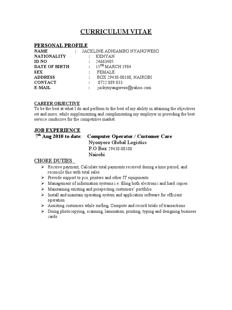 Computer Operator / Customer Care Nyonyoro Global Logistics P.O Box 29430-00100 Nairobi
