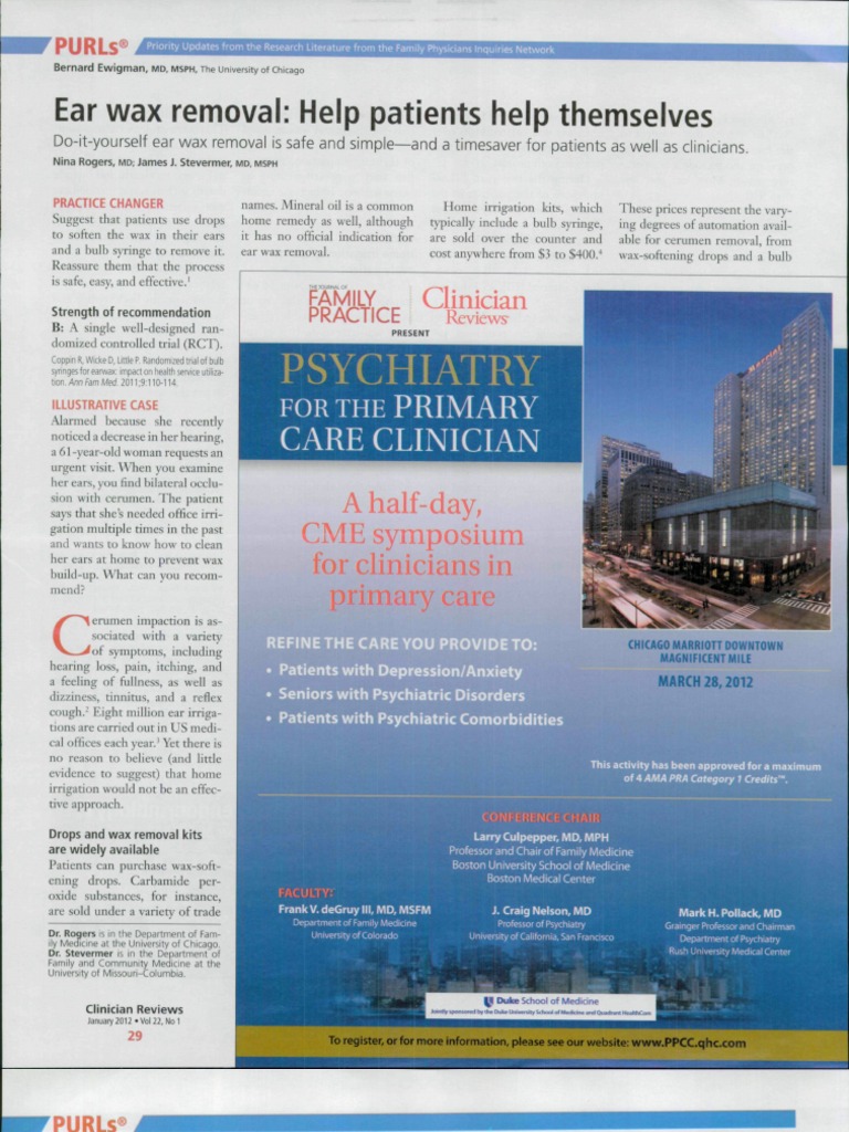 Suggest that patients use drops to soften the wax in their ears and a bulb syringe to remove it. Reassure them that the process is safe, easy, and effective.' Strength of recommendation B: A single well-designed randomized controlled trial (RCT).