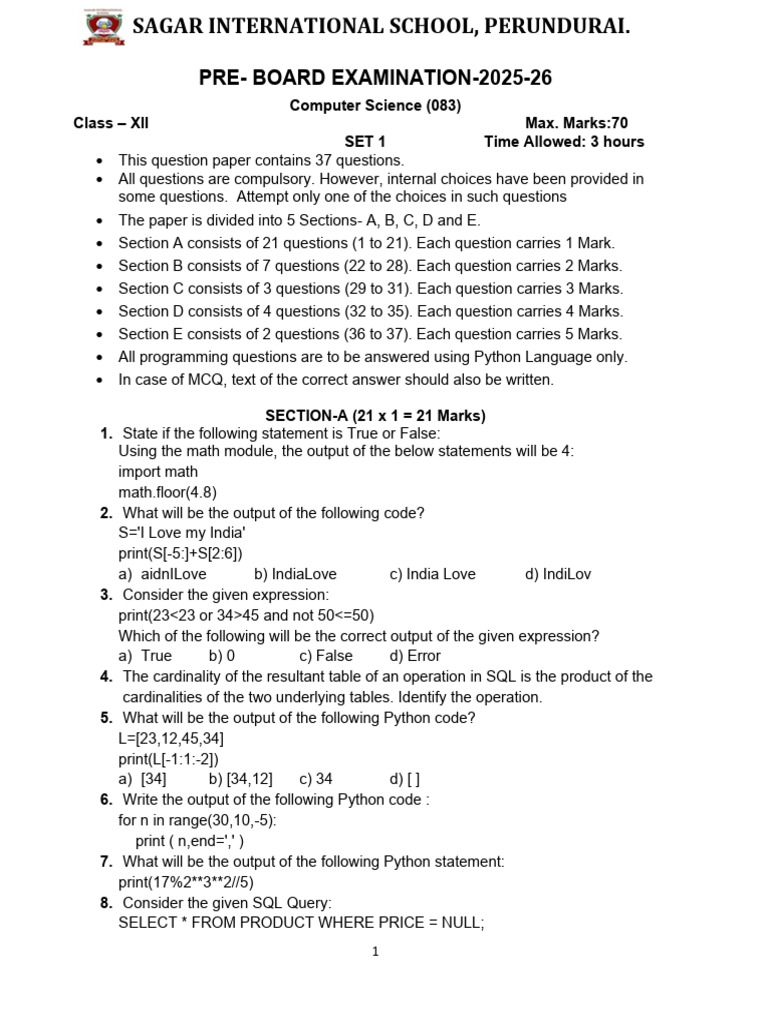 • Section E consists of 2 questions (36 to 37). Each question carries 5 Marks.