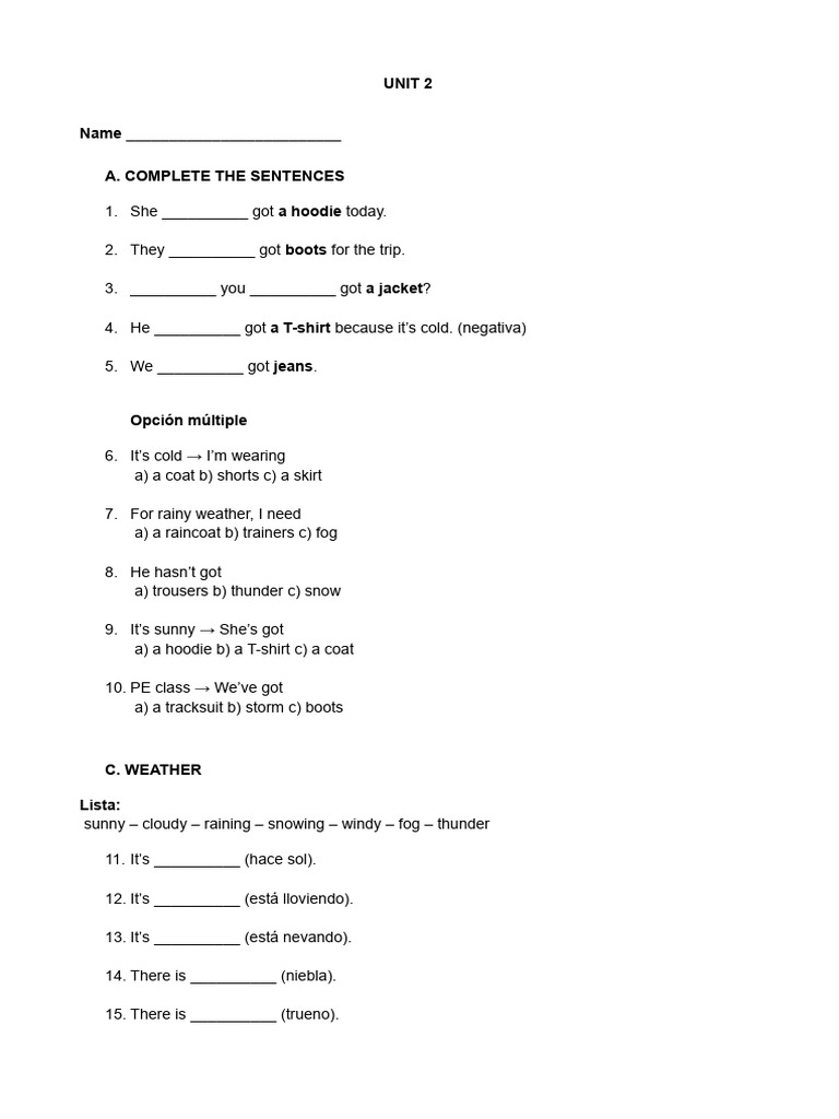 Elige ropa de la lista y escribe 3 frases con HAVE GOT + WEATHER:
