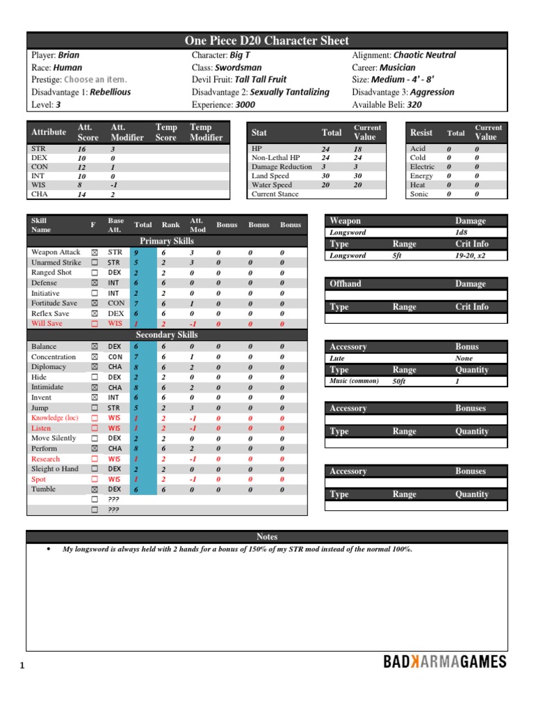 One Piece D20 Character Sheet