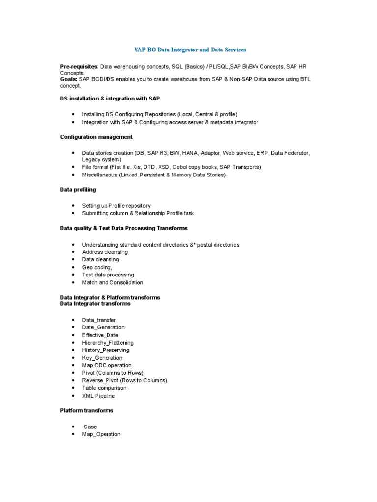 Pre-requisites: Data warehousing concepts, SQL (Basics) / PL/SQL,SAP BI/BW Concepts, SAP HR Concepts Goals: SAP BODI/DS enables you to create warehouse from SAP & Non-SAP Data source using BTL concept. DS installation & integration with SAP