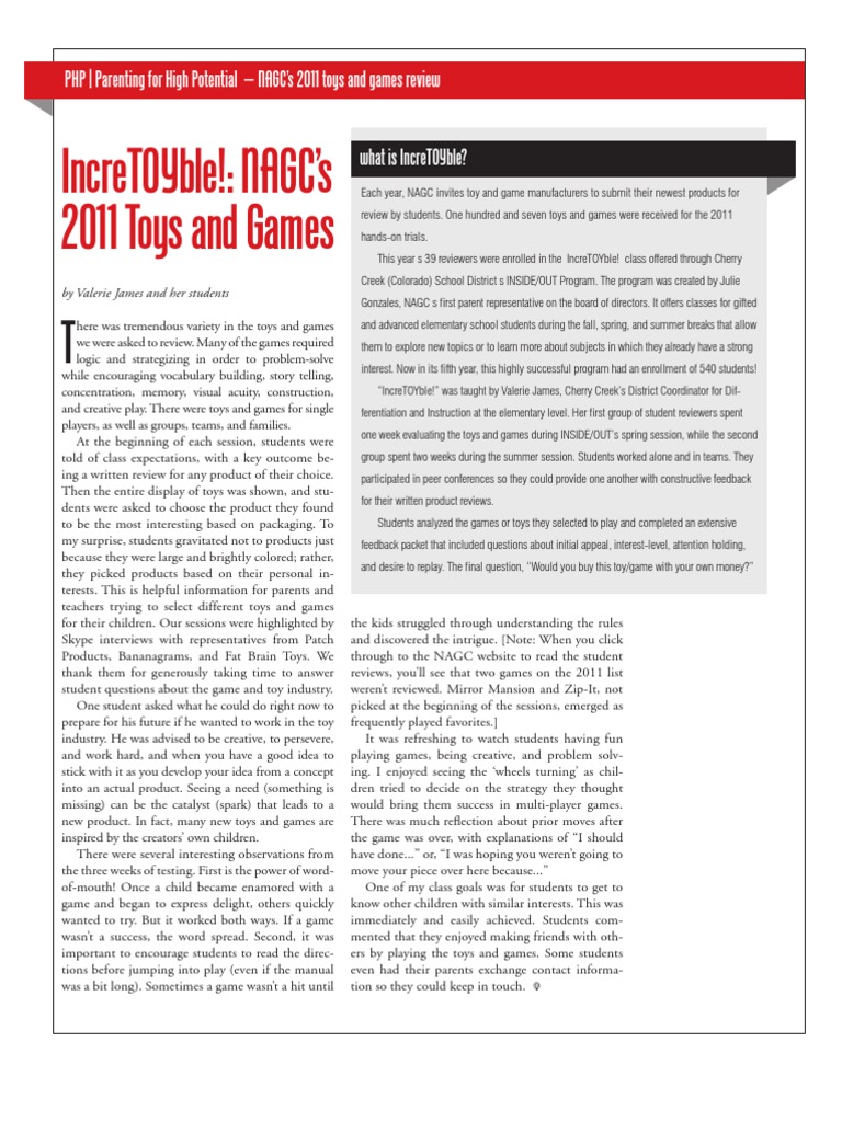 Each year, NAGC invites toy and game manufacturers to submit their newest products for review by students. One hundred and seven toys and games were received for the 2011 hands-on trials. This years 39 reviewers were enrolled in the IncreTOYble! class offered through Cherry Creek (Colorado) School Districts INSIDE/OUT Program. The program was created by Julie Gonzales, NAGCs first parent representative on the board of directors. It offers classes for gifted and advanced elementary school students during the fall, spring, and summer breaks that allow them to explore new topics or to learn more about subjects in which they already have a strong interest. Now in its fifth year, this highly successful program had an enrollment of 540 students! IncreTOYble! was taught by Valerie James, Cherry Creeks District Coordinator for Differentiation and Instruction at the elementary level. Her first group of student reviewers spent one week evaluating the toys and games during INSIDE/OUTs spring session, while the second group spent two weeks during the summer session. Students worked alone and in teams. They participated in peer conferences so they could provide one another with constructive feedback for their written product reviews. Students analyzed the games or toys they selected to play and completed an extensive feedback packet that included questions about initial appeal, interest-level, attention holding, and desire to replay. The final question, Would you buy this toy/game with your own money?