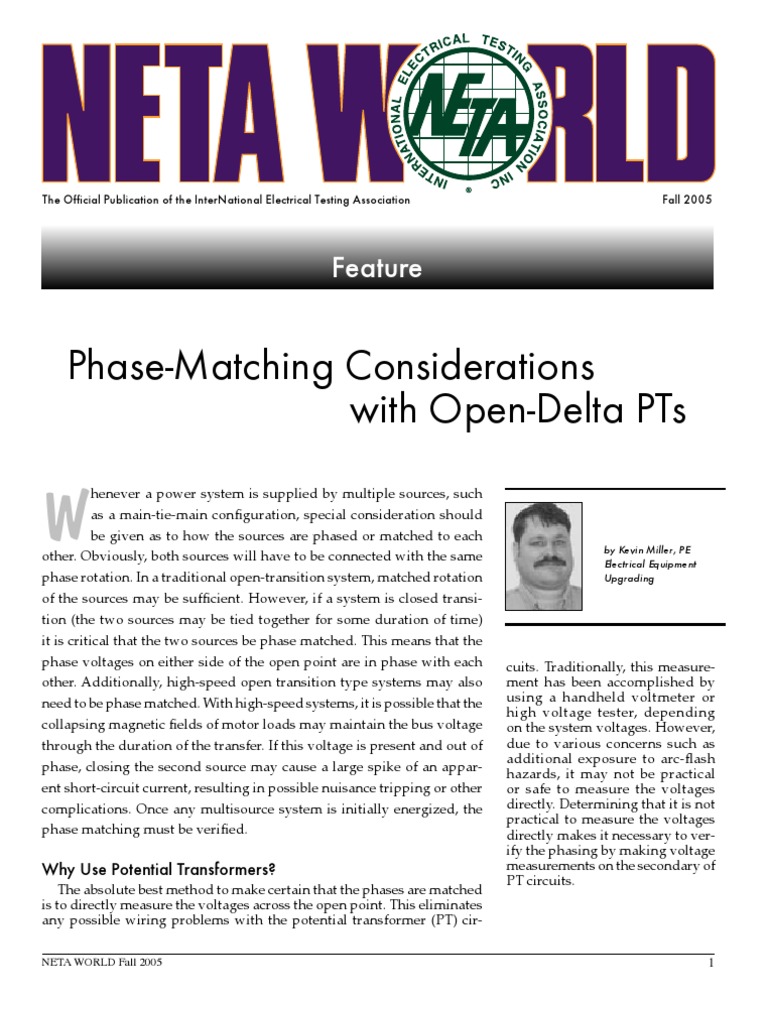 The absolute best method to make certain that the phases are matched is to directly measure the voltages across the open point. This eliminates any possible wiring problems with the potential transformer (PT) cirNETA WORLD Fall 2005