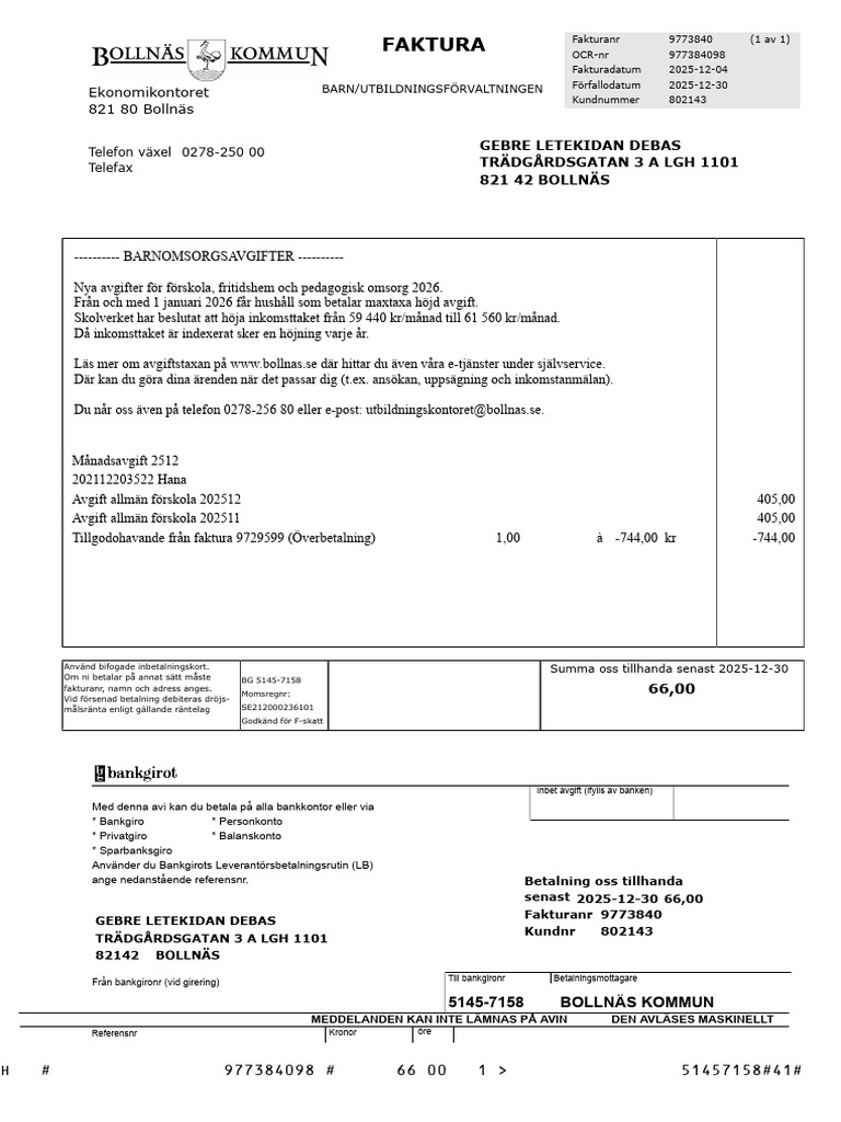 1101%%XmlEDPPostNr = 82142%%XmlEDPPostAdress = BOLLNÄS%%XmlEDPLandKod = SE%%XmlEDPFakturaDatum = 20251204%%XmlEDPForfalloDatum = 20251230%%XmlEDPOCR = 977384098%%XmlEDPFakturaBelopp = 6600%%XmlEDPAutogiro = Nej%%XmlEDPAGReferens = 198301036748%%XmlEDPEfakturamottagare = %%XmlEDPDistibutionssatt = %%XmlEDPBank = %%XmlEDPEfakturaPnr = 198301036748%%XmlEDPPGBGNummer = BG51457158%%XmlEDPMobilNummer = %%XmlEDPSkickaSMS = N%%XmlEDPSMSText = %%XmlEDPEPostJN = N%%XmlEDPBlankettKod = %%XmlEDPAnvandHelaSidan = Ja%%XmlEDPRefFoljandeSidor = %%XmlEDPPGBGBlankett = BG%%