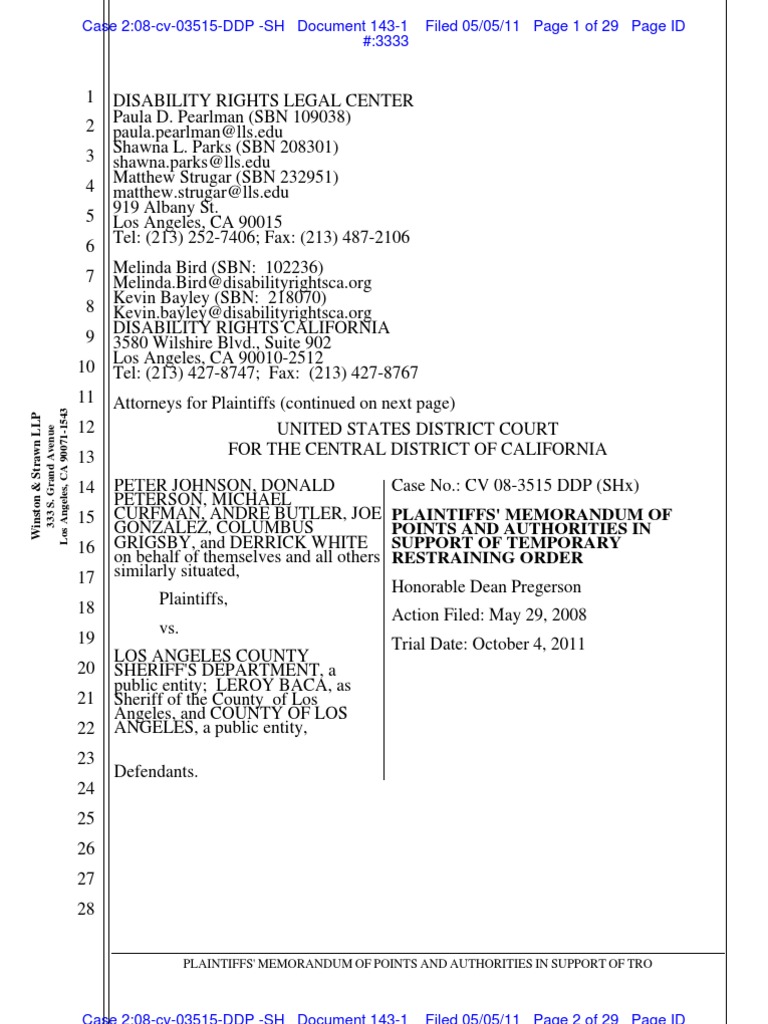 DISABILITY RIGHTS LEGAL CENTER Paula D. Pearlman (SBN 109038) paula.pearlman@lls.edu Shawna L. Parks (SBN 208301) shawna.parks@lls.edu Matthew Strugar (SBN 232951) matthew.strugar@lls.edu 919 Albany St. Los Angeles, CA 90015 Tel: (213) 252-7406; Fax: (213) 487-2106 Melinda Bird (SBN: 102236) Melinda.Bird@disabilityrightsca.org Kevin Bayley (SBN: 218070) Kevin.bayley@disabilityrightsca.org DISABILITY RIGHTS CALIFORNIA 3580 Wilshire Blvd., Suite 902 Los Angeles, CA 90010-2512 Tel: (213) 427-8747; Fax: (213) 427-8767 Attorneys for Plaintiffs (continued on next page) UNITED STATES DISTRICT COURT FOR THE CENTRAL DISTRICT OF CALIFORNIA PETER JOHNSON, DONALD PETERSON, MICHAEL CURFMAN, ANDRE BUTLER, JOE GONZALEZ, COLUMBUS GRIGSBY, and DERRICK WHITE on behalf of themselves and all others similarly situated, Plaintiffs, vs. LOS ANGELES COUNTY SHERIFF'S DEPARTMENT, a public entity; LEROY BACA, as Sheriff of the County of Los Angeles, and COUNTY OF LOS ANGELES, a public entity, Defendants. Case No.: CV 08-3515 DDP SHx)