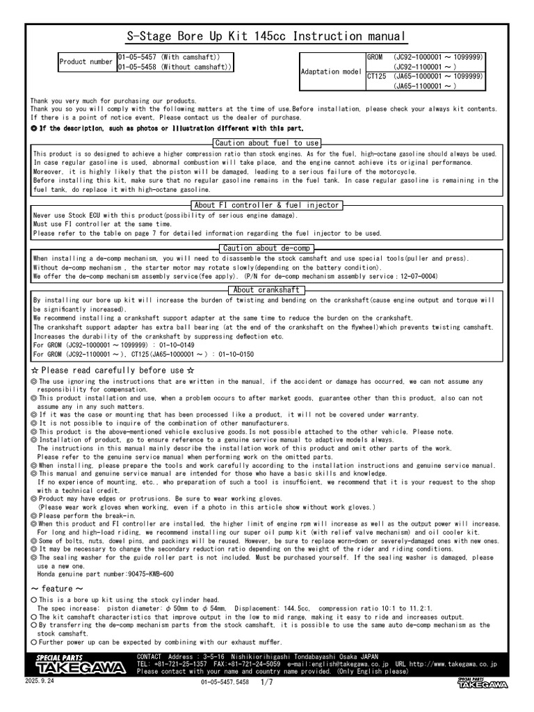 S-Stage Bore Up Kit 45cc Instruction Manual