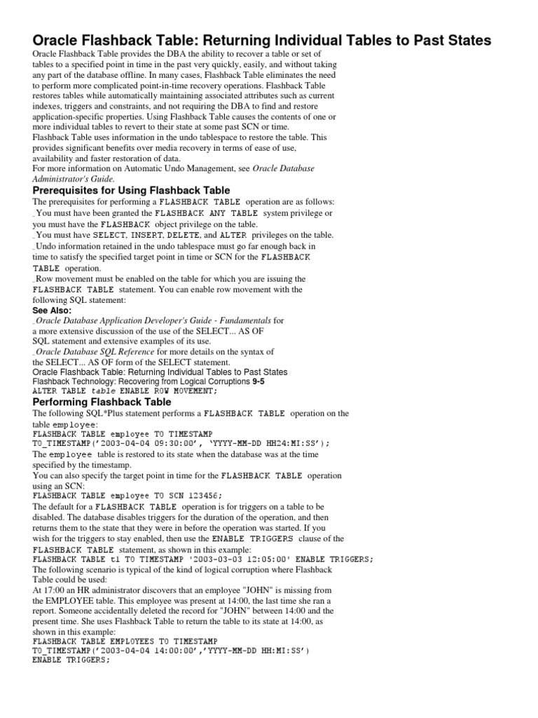 Flashback Technology: Recovering from Logical Corruptions 9-5 ALTER TABLE table ENABLE ROW MOVEMENT;