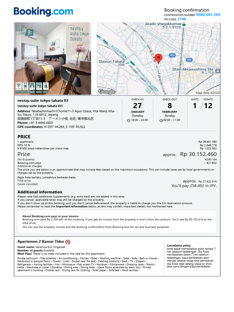This print version of your confirmation contains the most important information about your booking. It can be used to check in when you arrive at nestay suite tokyo tabata