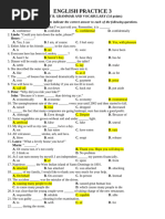 B VOCABULARY & GRAMMAR: 1) Quite a few students were absent today. A. very few A. supported A. stood A. gulp A. emulated A. free A. brought up B. not few B. played tricks on B. appeared B. flip B. counted on B. home-made B. fed up with C. not many C. laughed at C. sat down C. yelp C. looked up to C. not good C. born D. fed D. many D. hit D. knocked D. purr D. obeyed D. good 2) All through the faculty meeting Frank stood up for his friend who was being criticized so severely. 3) I hadnt seen him for ages and then he suddenly turned up on my door-step. 4) Veterinarians usually give dogs an aesthetic so that they dont cry out in pain. 5) The Congress respected Jefferson because although he was stern, he was fair. 6) The bartender said, The drinks are on the house. 7) My wife has just given birth to twins.