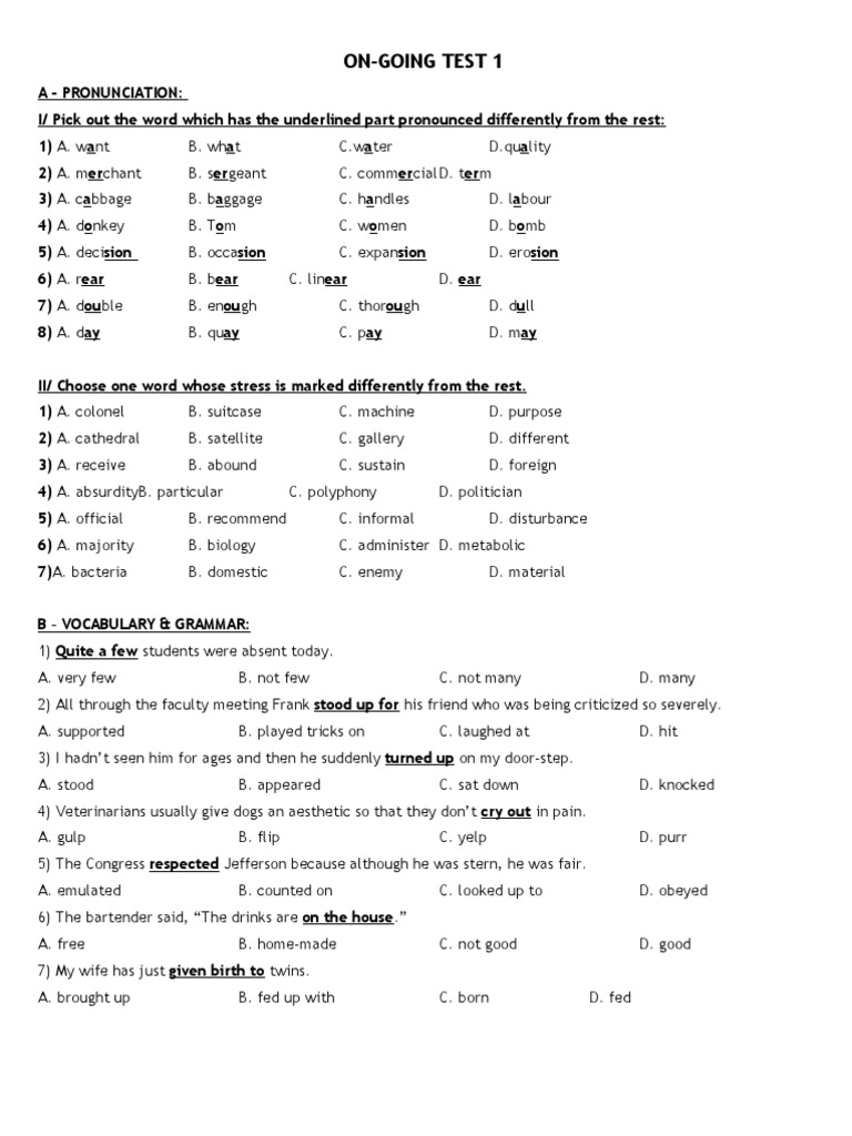 A - PRONUNCIATION: I/ Pick out the word which has the underlined part pronounced differently from the rest: 1) A. want 2) A. merchant 3) A. cabbage 4) A. donkey 5) A. decision 6) A. rear 7) A. double 8) A. day B. what B. sergeant B. baggage B. Tom B. occasion B. bear B. enough B. quay C.water C. handles C. women C. expansion C. linear C. thorough C. pay D. ear D. dull D. may D.quality D. labour D. bomb D. erosion C. commercial D. term