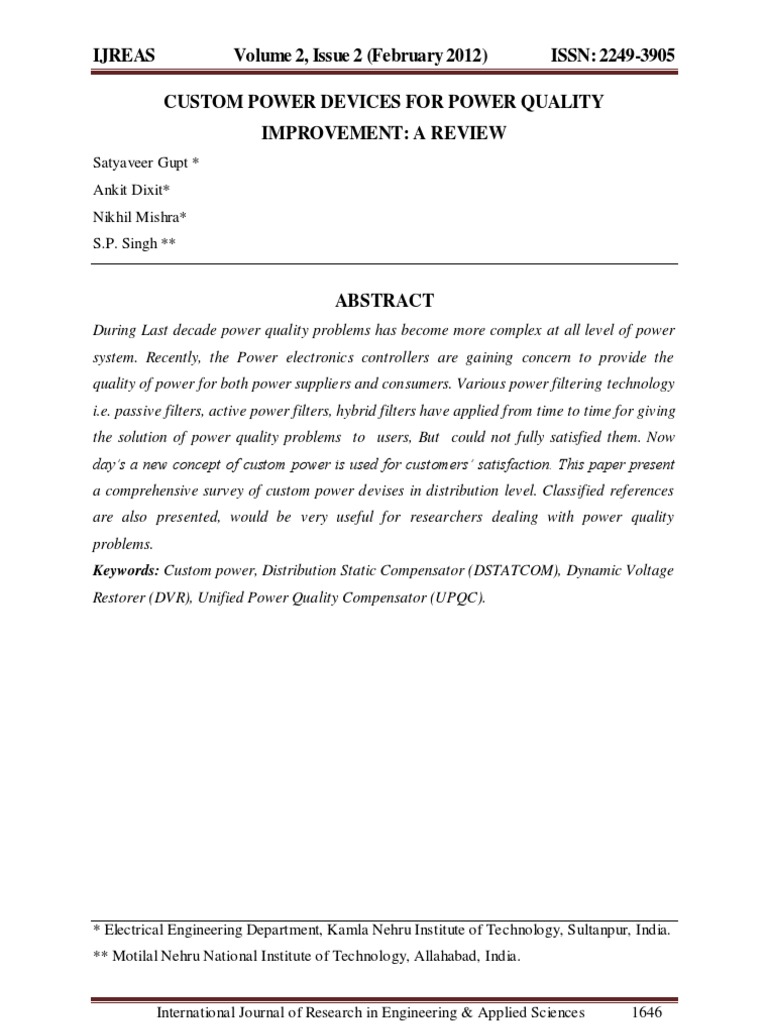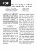 30. H. Mokhtari, S. B. Dewan, M. R. Travani, Performance evaluation of thyristor based static transfer switch, IEEE Transactions on Power Delivery., vol. 15, no.3, July 2000, pp. 960 -966. 31. P. Bowler, UPS Specifications & Performance,IEE Colloquium on Uninterruptible Power Supplies, 1994, pp. 111 -1113. 32. A. Sannino, M. G. Mller, M. H. J. Bollen Overview of Voltage Sag Mitigation. in Proc. Of the IEEE IPES Winter Meeting 2000, Singapure, vol. 4, pp. 2872 -2878. 33. S M. Ramsay, Cronin PE, R. J. Nelson; J. Bian, F. E. Menendeze, Using Distribution static compensators (D-STATCOMs) to extend the capability of voltagelimited distribution feeders, in Proc. of the 39th Annual conference of Rural Electric Power, 28-30 Sep 1996, pp. A4/18-A4/24. 34. M.H. Haque, "Compensation of distribution system voltage sag by DVR and DSTATCOM," in Proc. IEEE Power Tech., vol.1, pp.5, Sept.2001. 35. ]H. Mehta, V. H. Tahiliani, J. E. Sullivan, Custom Power: an opportunity for energy conversion, in Proc of the International Conference on Electricity Distribution CIRED 1993, pp. 5.23/1- 5.23/6. 36. E Acha, V G Agelidis, O Anaya-Lara, T J E Miller, Power Electronic Control in Electrical Systems , Newnes Power Engineering series,2002. 37. [Link], A. Ghosh, and A. Joshi, "Operation of a DSTATCOM in voltage control mode," IEEE Trans. Pow. Del.,vol. 1 8,pp.258-264,Jan.2003. 38. G. Ledwich and A. Ghosh, "A flexible DSTATCOM operating in voltage or current control mode," Proc. IEE Generation, Transmission and Distribution, vol. 149, pp.215-224, March 2002. 39. [Link] and G. Ledwich, "Load compensating DSTATCOM in weak AC systems," vol. 18, pp. 1302-1309, Oct.2003. 40. J. E. B11, A practical example of the use of static compensator (D-STATCOM) to reduce voltage IEE colloquium on Power Electronics for Renewable Energy, (Digest No. 199711 70), pp.7/1-7/5,Jun 1997. 41. Edwards, Abi-Samra, Woodley, Armanini, Clouston, Malcolm and Sundaram, Static Compensator for Distribution Systems. PQA97 Europe, Stockholm, Sweden, June1997. 42. N. H. Woodley; S. fiddlekauff; A. Sundaram, Dynamic Voltage Restorer Demonstration Project Experience, in Proc of the 51Annual Power Distribution Conference, The University of Texas Austin, Oct. 19-21, 1998. International Journal of Research in Engineering & Applied Sciences [Link] 1658