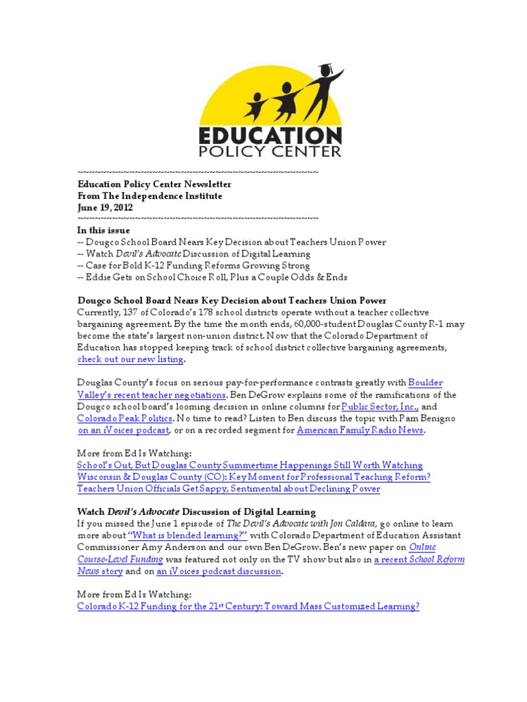 -- Dougco School Board Nears Key Decision about Teachers Union Power -- Watch Devils Advocate Discussion of Digital Learning -- Case for Bold K-12 Funding Reforms Growing Strong -- Eddie Gets on School Choice Roll, Plus a Couple Odds & Ends Dougco School Board Nears Key Decision about Teachers Union Power Currently, 137 of Colorados 178 school districts operate without a teacher collective bargaining agreement. By the time the month ends, 60,000-student Douglas County R-1 may become the states largest non-union district. Now that the Colorado Department of Education has stopped keeping track of school district collective bargaining agreements, check out our new listing. Douglas Countys focus on serious pay-for-performance contrasts greatly with Boulder Valleys recent teacher negotiations. Ben DeGrow explains some of the ramifications of the Dougco school boards looming decision in online columns for Public Sector, Inc., and Colorado Peak Politics. No time to read? Listen to Ben discuss the topic with Pam Benigno on an iVoices podcast, or on a recorded segment for American Family Radio News. More from Ed Is Watching: Schools Out, But Douglas County Summertime Happenings Still Worth Watching Wisconsin & Douglas County (CO): Key Moment for Professional Teaching Reform? Teachers Union Officials Get Sappy, Sentimental about Declining Power Watch Devils Advocate Discussion of Digital Learning If you missed the June 1 episode of The Devils Advocate with Jon Caldara, go online to learn more about What is blended learning? with Colorado Department of Education Assistant Commissioner Amy Anderson and our own Ben DeGrow. Bens new paper on Online Course-Level Funding was featured not only on the TV show but also in a recent School Reform News story and on an iVoices podcast discussion. More from Ed Is Watching: Colorado K-12 Funding for the 21st Century: Toward Mass Customized Learning?