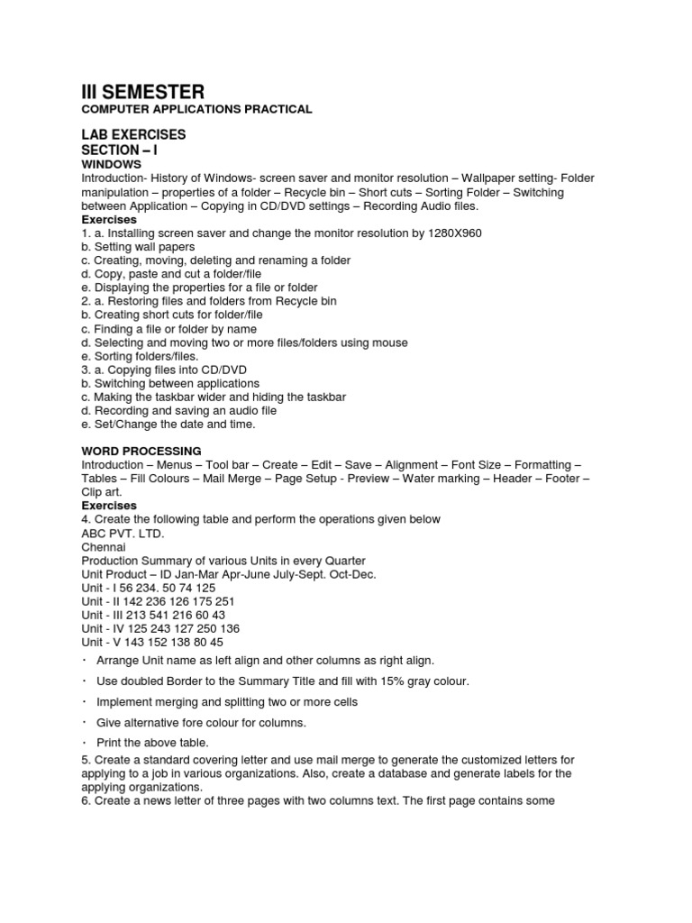 WINDOWS Introduction- History of Windows- screen saver and monitor resolution Wallpaper setting- Folder manipulation properties of a folder Recycle bin Short cuts Sorting Folder Switching between Application Copying in CD/DVD settings Recording Audio files. Exercises 1. a. Installing screen saver and change the monitor resolution by 1280X960 b. Setting wall papers c. Creating, moving, deleting and renaming a folder d. Copy, paste and cut a folder/file e. Displaying the properties for a file or folder 2. a. Restoring files and folders from Recycle bin b. Creating short cuts for folder/file c. Finding a file or folder by name d. Selecting and moving two or more files/folders using mouse e. Sorting folders/files. 3. a. Copying files into CD/DVD b. Switching between applications c. Making the taskbar wider and hiding the taskbar d. Recording and saving an audio file e. Set/Change the date and time. WORD PROCESSING Introduction Menus Tool bar Create Edit Save Alignment Font Size Formatting Tables Fill Colours Mail Merge Page Setup - Preview Water marking Header Footer Clip art. Exercises 4. Create the following table and perform the operations given below ABC PVT. LTD. Chennai Production Summary of various Units in every Quarter Unit Product ID Jan-Mar Apr-June July-Sept. Oct-Dec. Unit - I 56 234. 50 74 125 Unit - II 142 236 126 175 251 Unit - III 213 541 216 60 43 Unit - IV 125 243 127 250 136 Unit - V 143 152 138 80 45 Arrange Unit name as left align and other columns as right align. Use doubled Border to the Summary Title and fill with 15% gray colour. Implement merging and splitting two or more cells Give alternative fore colour for columns. Print the above table. 5. Create a standard covering letter and use mail merge to generate the customized letters for applying to a job in various organizations. Also, create a database and generate labels for the applying organizations. 6. Create a news letter of three pages with two columns text. The first page contains some