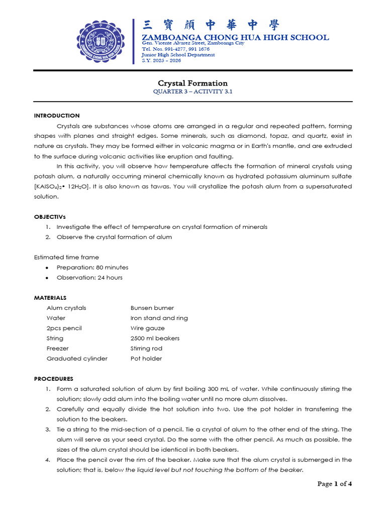 1. Form a saturated solution of alum by first boiling 300 mL of water. While continuously stirring the
