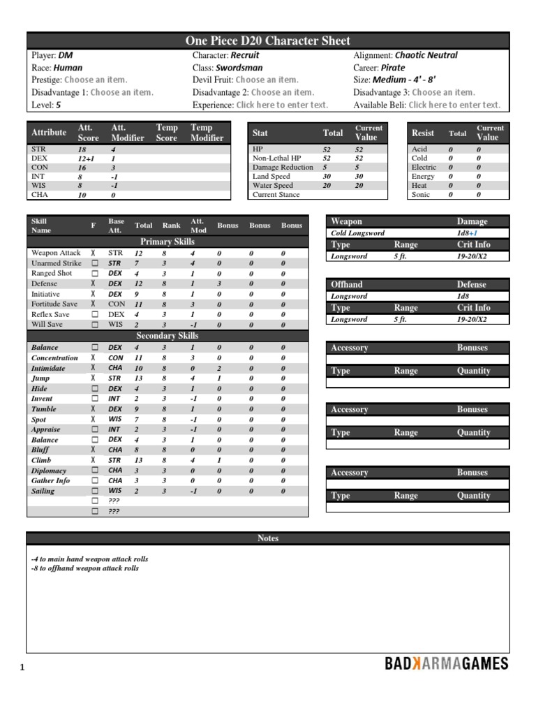 Character: Recruit Class: Swordsman Devil Fruit: Choose an item. Disadvantage 2: Choose an item. Experience: Click here to enter text. Temp Score Temp Modifier Stat