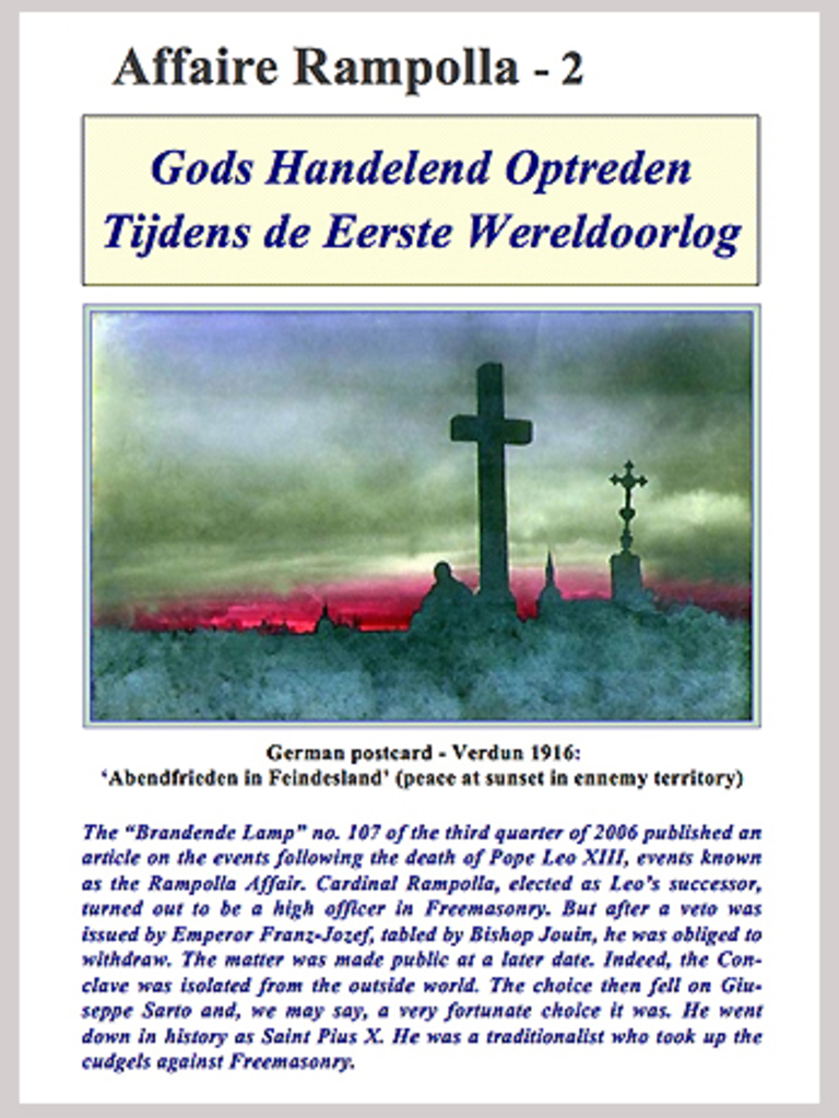 In de Brandende Lamp nr. 107 van het derde kwartaal 2006 verscheen een artikel over de gebeurtenissen na het overlijden van Paus Leo XIII. Die staan bekend als de affaire Ram- polla. Kardinaal Rampolla die tot zijn opvolger werd benoemd, bleek een hoge Vrijmetselaar te zijn. Maar na het uitspreken van het veto van keizer Franz-Jozef, dat bisschop Jouin bij zich droeg, moest hij terugtreden. Dat werd pas veel later publiek. Het conclaaf was immers van de buitenwereld afgezonderd. Op Giuseppe Sarto viel toen de keus, we mogen wel zeg- gen: een heel gelukkige. Hij ging de geschiedenis in als de Heilige Paus Pius X. Als tradi-tionalist nam hij het op tegen de Vrijmetselarij.