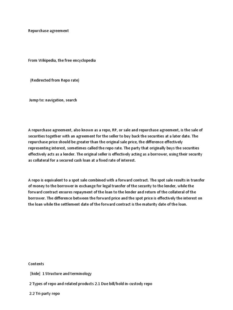 Contents [hide] 1 Structure and terminology 2 Types of repo and related products 2.1 Due bill/hold in-custody repo 2.2 Tri-party repo