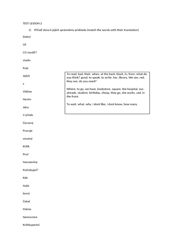 1) Přiřaď slova k jejich správnému překladu (match the words with their translation)