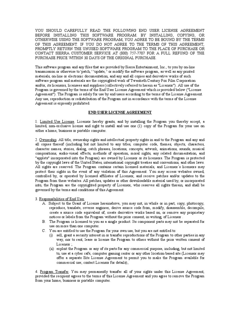BY INSTALLING, COPYING, OR OTHERWISE USING THE SOFTWARE PROGRAM, YOU AGREE TO BE BOUND BY THE TERMS OF THIS AGREEMENT. IF YOU DO NOT AGREE TO THE TERMS OF THIS AGREEMENT, PROMPTLY RETURN THE UNUSED SOFTWARE PROGRAM TO THE PLACE OF PURCHASE OR CONTACT SIERRA CUSTOMER SERVICE AT (800) 757-7707 FOR A FULL REFUND OF THE PURCHASE PRICE WITHIN 30 DAYS OF THE ORIGINAL PURCHASE. This software program and any files that are provided by Sierra Entertainment, Inc., to you by on-line transmission or otherwise to 'patch, ' 'update, ' or modify the software program, as well as any printed materials, on-line or electronic documentation, and any and all copies and derivative works of such software program and materials are the copyrighted work of Twentieth Century Fox Film Corporation and/or, its licensors, licensees and suppliers (collectively referred to herein as "Licensor"). All use of the Program is governed by the terms of the End User License Agreement which is provided below ("License Agreement"). The Program is solely for use by end users according to the terms of the License Agreement. Any use, reproduction or redistribution of the Program not in accordance with the terms of the License Agreement is expressly prohibited. END USER LICENSE AGREEMENT 1. Limited Use License. Licensor hereby grants, and by installing the Program you thereby accept, a limited, non-exclusive license and right to install and use one (1) copy of the Program for your use on either a home, business or portable computer. 2. Ownership. All title, ownership rights and intellectual property rights in and to the Program and any and all copies thereof (including but not limited to any titles, computer code, themes, objects, characters, character names, stories, dialog, catch phrases, locations, concepts, artwork, animations, sounds, musical compositions, audio-visual effects, methods of operation, moral rights, any related documentation, and "applets" incorporated into the Program) are owned by Licensor or its licensors. The Program is protected by the copyright laws of the United States, international copyright treaties and conventions, and other laws. All rights are reserved. The Program contains certain licensed materials, and Licensors licensors may protect their rights in the event of any violation of this Agreement. You may access websites owned, controlled by, or operated by licensed affiliates of Licensor, and receive patches and/or updates to the Program from these websites. All patches, updates or other downloadable material used by, or incorporated into, the Program are the copyrighted property of Licensor, who reserves all rights therein, and shall be governed by the terms and conditions of this Agreement. 3. Responsibilities of End User. A. Subject to the Grant of License hereinabove, you may not, in whole or in part, copy, photocopy, reproduce, translate, reverse engineer, derive source code from, modify, disassemble, decompile, create a source code equivalent of, create derivative works based on, or remove any proprietary notices or labels from the Program without the prior consent, in writing, of Licensor . B. The Program is licensed to you as a single product. Its component parts may not be separated for use on more than one computer. C. You are entitled to use the Program for your own use, but you are not entitled to: (i) sell, grant a security interest in or transfer reproductions of the Program to other parties in any way, nor to rent, lease or license the Program to others without the prior written consent of Licensor ; (ii) exploit the Program or any of its parts for any commercial purpose, including, but not limited to, use at a cyber caf, computer gaming center or any other location-based site (Licensor may offer a separate Site License Agreement to permit you to make the Program available for commercial use; contact Licensor for details); 4. Program Transfer. You may permanently transfer all of your rights under this License Agreement, provided the recipient agrees to the terms of this License Agreement and you agree to remove the Program from your home, business or portable computer.